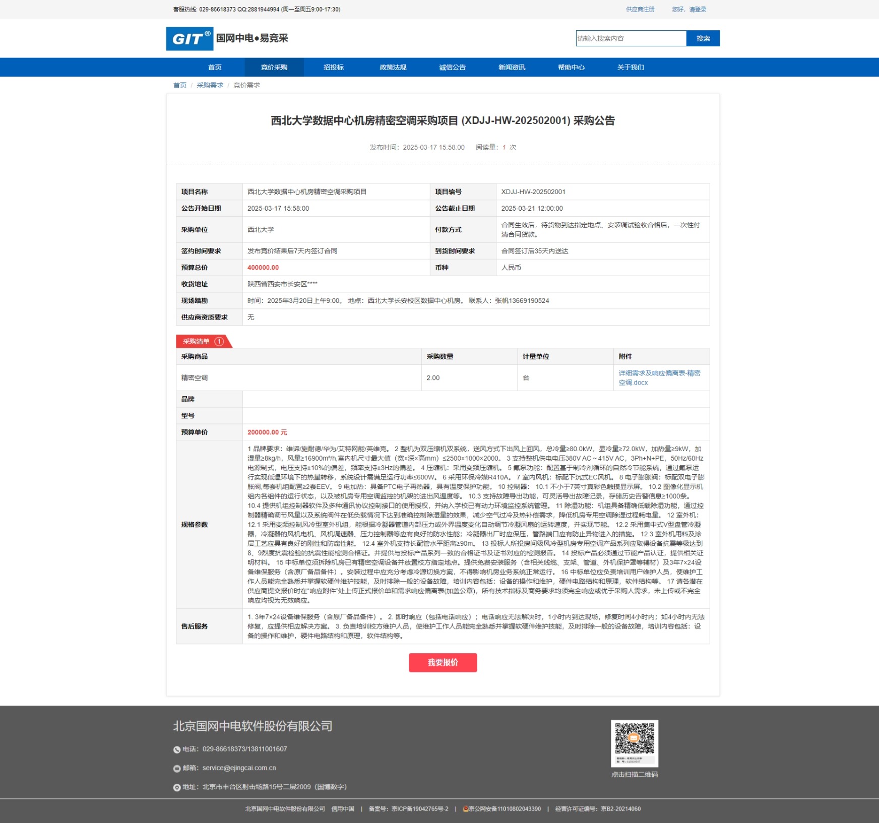 伟德国际1949始于英国数据中心机房精密空调采购项目 (XDJJ-HW-202502001)网上竞价采购公告 作者: 编辑:采购与招标办公室 时间:2025-03-17 原公告链接:https://www.ejingcai.com.cn/site/bidding/detail/16997