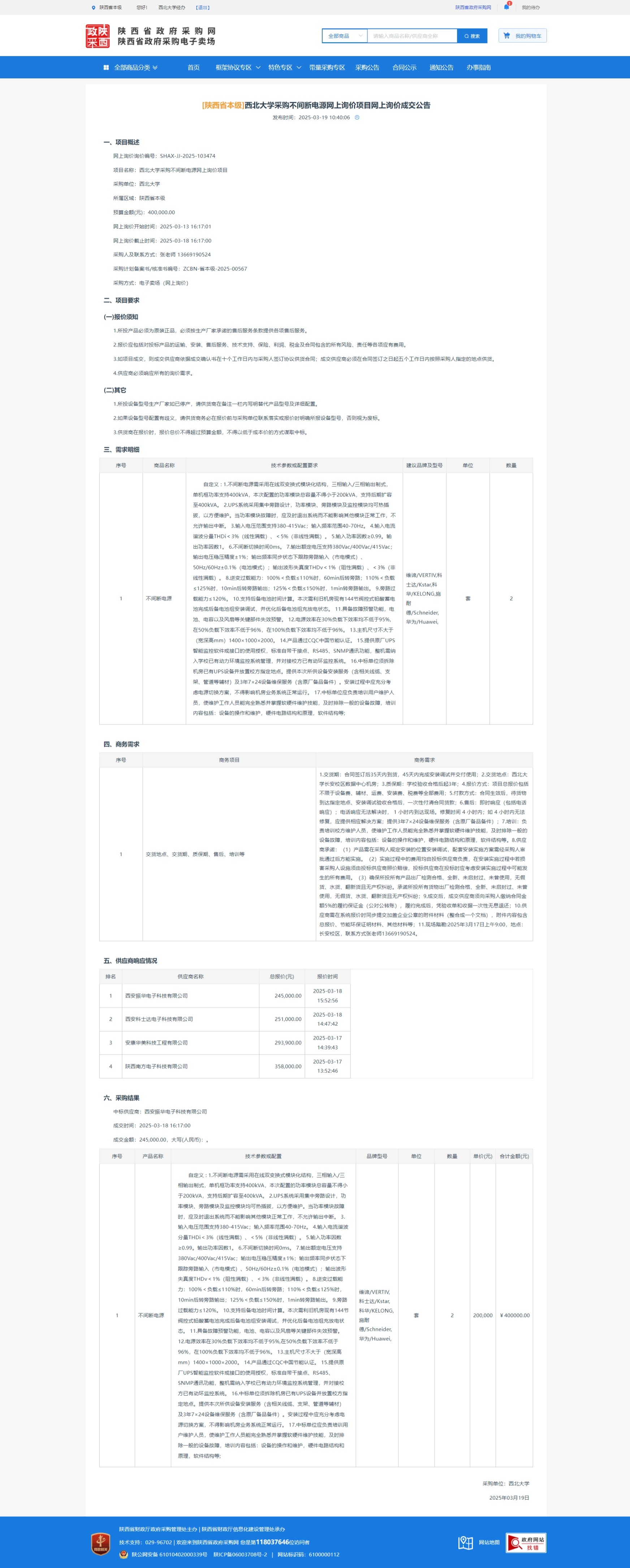 伟德国际1949始于英国采购不间断电源网上询价项目网上询价成交公告 作者: 编辑:采购与招标办公室 时间:2025-03-19 原公告链接:https://www.ccgp-shaanxi.gov.cn/gpmall-main-web/basic/noticeDetail?noticeGuid=7301336059869331456
