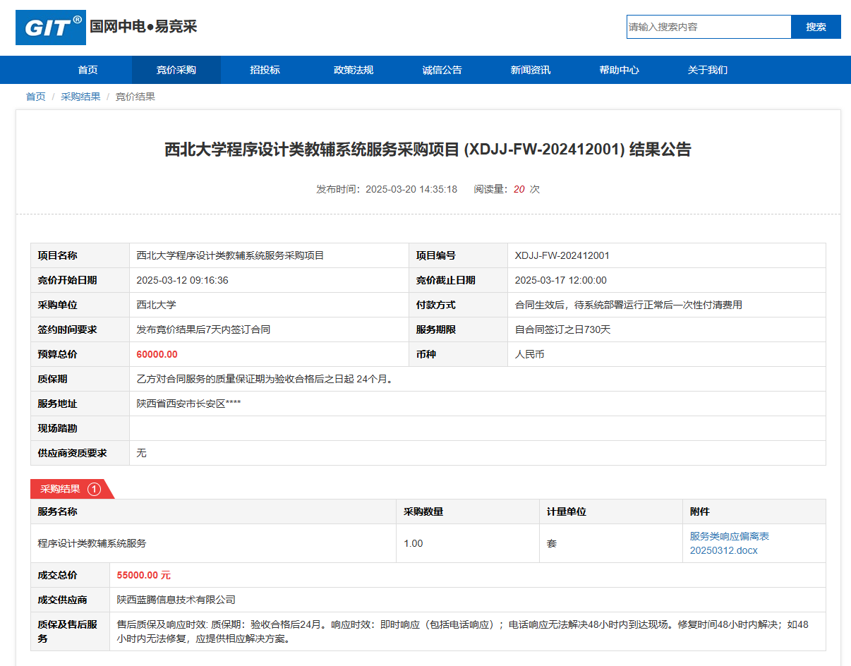 伟德国际1949始于英国程序设计类教辅系统服务采购项目(XDJJ-FW-202412001)竞价结果公告 作者:采购与招标办公室 编辑: 时间:2025-03-20 原公告链接:https://www.ejingcai.com.cn/site/bidding/detail/17064
