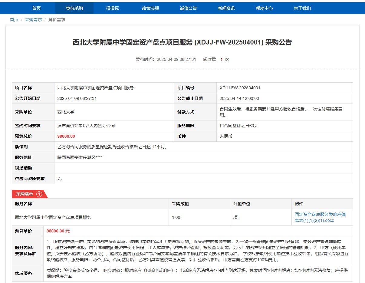 伟德国际1949始于英国附属中学固定资产盘点项目服务(XDJJ-FW-202504001)竞价采购公告 作者:采购与招标办公室 编辑: 时间:2025-04-09 原公告链接:https://www.ejingcai.com.cn/site/bidding/detail/17501