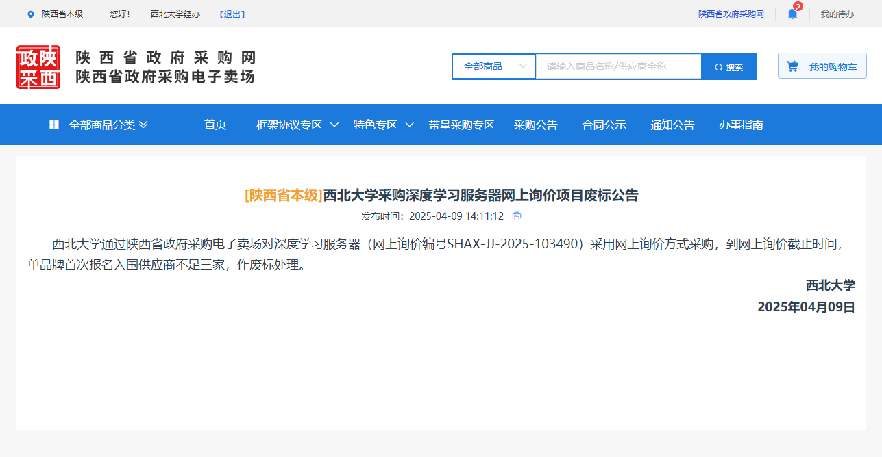 伟德国际1949始于英国采购深度学习服务器网上询价项目废标公告 作者:采购与招标办公室 编辑: 时间:2025-04-09 原公告链接:https://www.ccgp-shaanxi.gov.cn/gpmall-main-web/basic/noticeDetail?noticeGuid=7308999329707130880