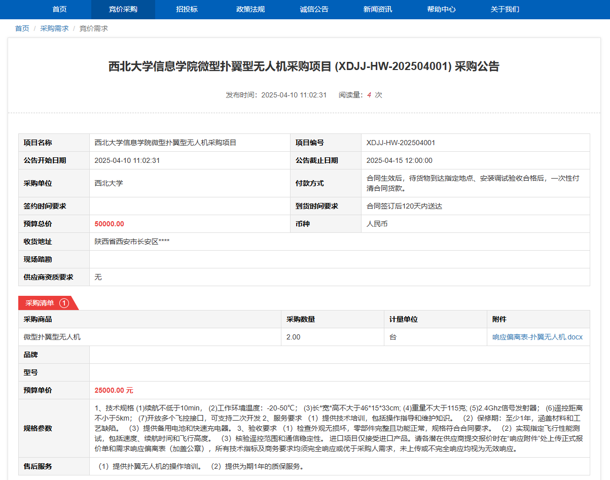 伟德国际1949始于英国信息学院微型扑翼型无人机采购项目(XDJJ-HW-202504001)竞价采购公告 作者:采购与招标办公室 编辑: 时间:2025-04-10 原公告链接:https://www.ejingcai.com.cn/site/bidding/detail/17536