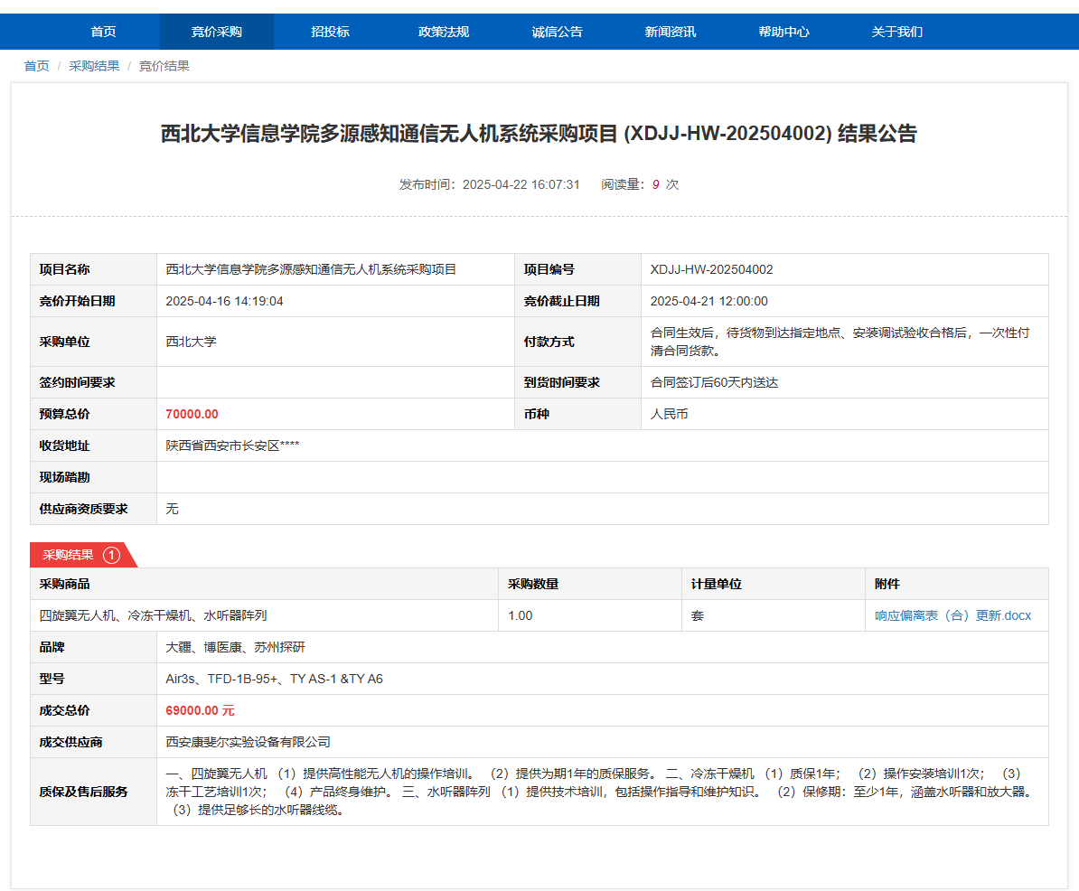 伟德国际1949始于英国信息学院多源感知通信无人机系统采购项目 (XDJJ-HW-202504002) 结果公告 作者:采购与招标办公室 编辑: 时间:2025-04-22 原公告链接:https://www.ejingcai.com.cn/site/bidding/detail/17844