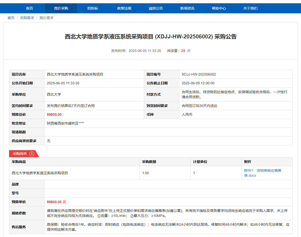 伟德国际1949始于英国地质学系液压系统采购项目(XDJJ-HW-202506002)竞价采购公告 作者: 编辑: 时间:2025-06-05 原公告链接:https://www.ejingcai.com.cn/site/bidding/detail/18680