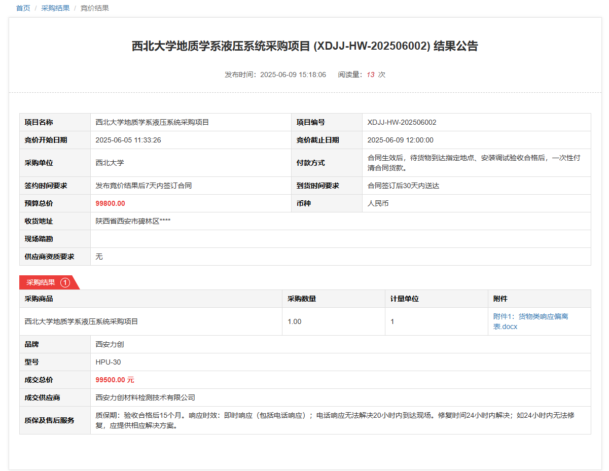 伟德国际1949始于英国地质学系液压系统采购项目(XDJJ-HW-202506002)竞价结果公告 作者:采购与招标办公室 编辑: 时间:2025-06-09 原公告链接:https://www.ejingcai.com.cn/site/bidding/detail/18744