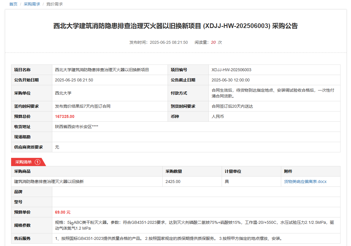 伟德国际1949始于英国建筑消防隐患排查治理灭火器以旧换新项目(XDJJ-HW-202506003)竞价采购公告 作者:采购与招标办公室 编辑: 时间:2025-06-25 原公告链接:https://www.ejingcai.com.cn/site/bidding/detail/19167