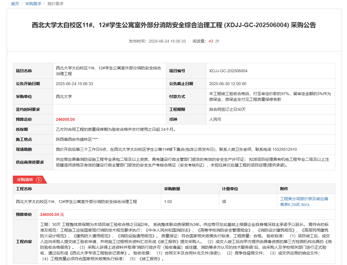 伟德国际1949始于英国太白校区11#、12#学生公寓室外部分消防安全综合治理工程(XDJJ-GC-202506004)竞价采购公告 作者:采购与招标办公室 编辑: 时间:2025-06-25 原公告链接:https://www.ejingcai.com.cn/site/bidding/detail/19136