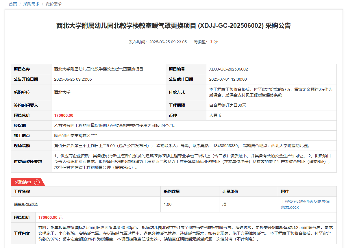 伟德国际1949始于英国附属幼儿园北教学楼教室暖气罩更换项目(XDJJ-GC-202506002)竞价采购公告 作者:采购与招标办公室 编辑: 时间:2025-06-25 原公告链接:https://www.ejingcai.com.cn/site/bidding/detail/19174