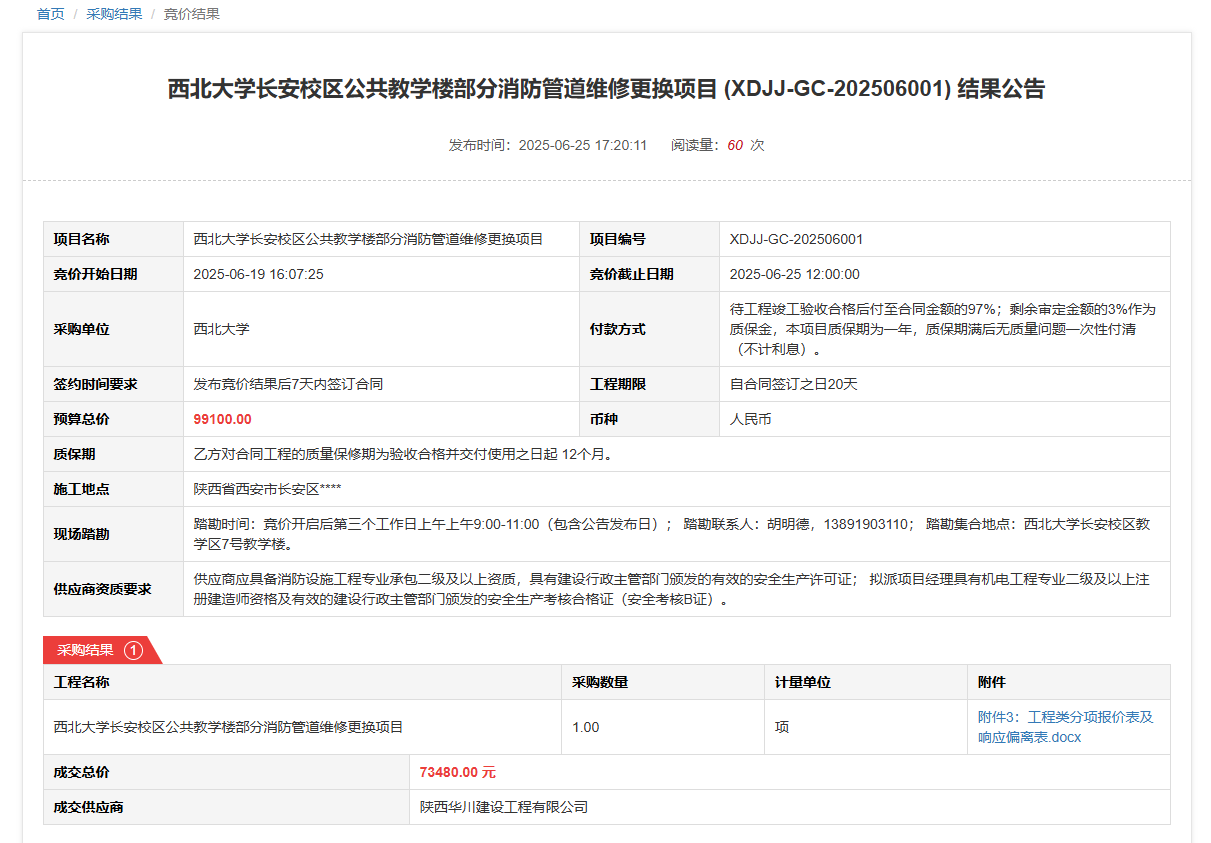 伟德国际1949始于英国长安校区公共教学楼部分消防管道维修更换项目(XDJJ-GC-202506001)竞价结果公告 作者:采购与招标办公室 编辑: 时间:2025-06-25 原公告链接:https://www.ejingcai.com.cn/site/bidding/detail/19191