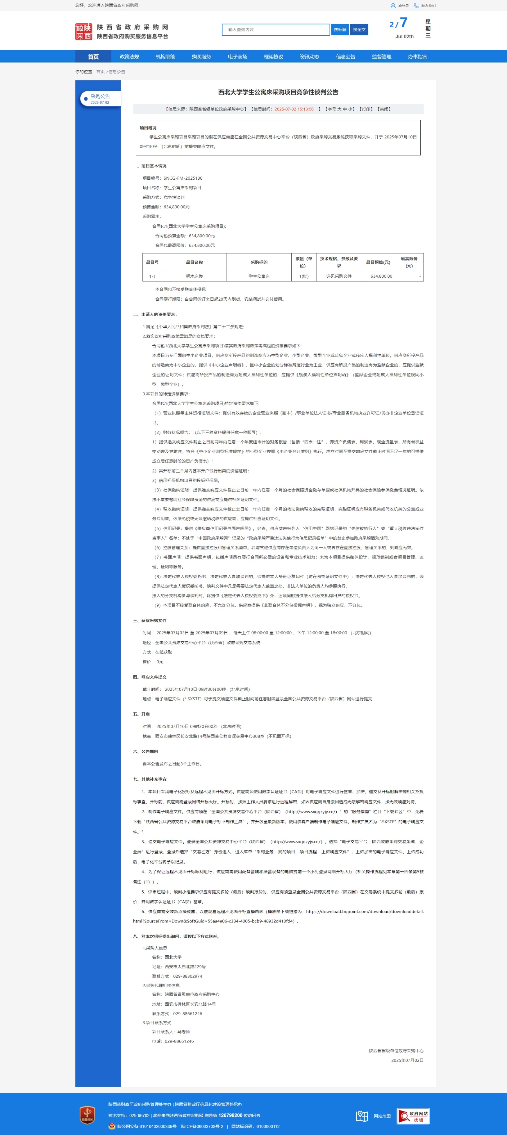 伟德国际1949始于英国学生公寓床采购项目竞争性谈判公告 作者: 编辑:采购与招标办公室 时间:2025-07-02 原公告链接:https://www.ccgp-shaanxi.gov.cn/freecms/site/shaanxi/ggxx/info/2025/8a69c67497a9ff030197c8e900a9510c.html?noticeType=001013¬iceId=1bd2af55-5716-11f0-8063-08c0eb20c666