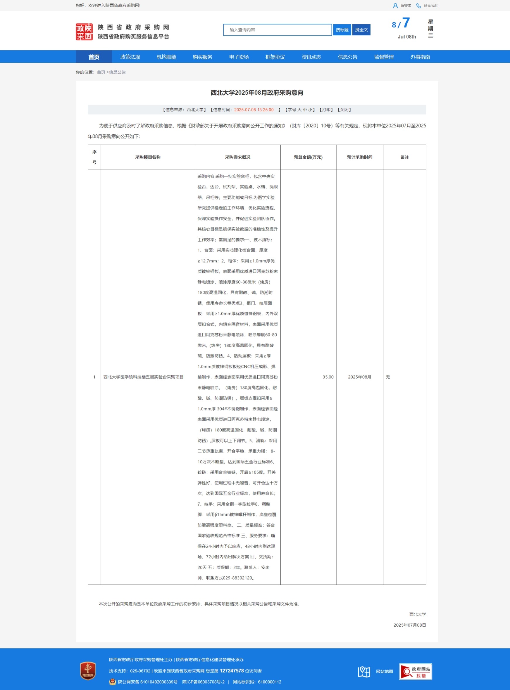 伟德国际1949始于英国2025年08月政府采购意向 作者: 编辑:采购与招标办公室 时间:2025-07-08 原公告链接:https://www.ccgp-shaanxi.gov.cn/freecms/site/shaanxi/ggxx/info/2025/8a69c68d97d2c4550197e87d6842455f.html?noticeType=59¬iceId=e4cb9cdd-5bbd-11f0-8063-08c0eb20c666