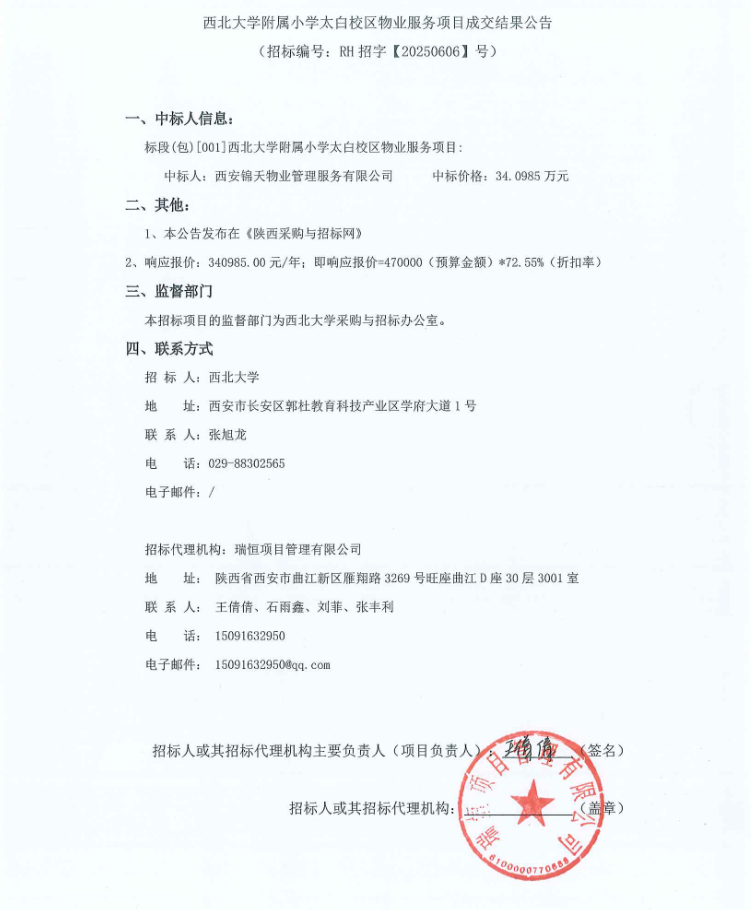 伟德国际1949始于英国附属小学太白校区物业服务项目成交结果公告