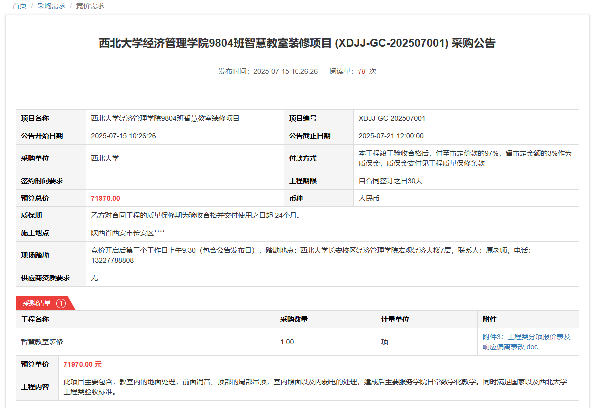 伟德国际1949始于英国经济管理学院9804班智慧教室装修项目(XDJJ-GC-202507001)竞价采购公告