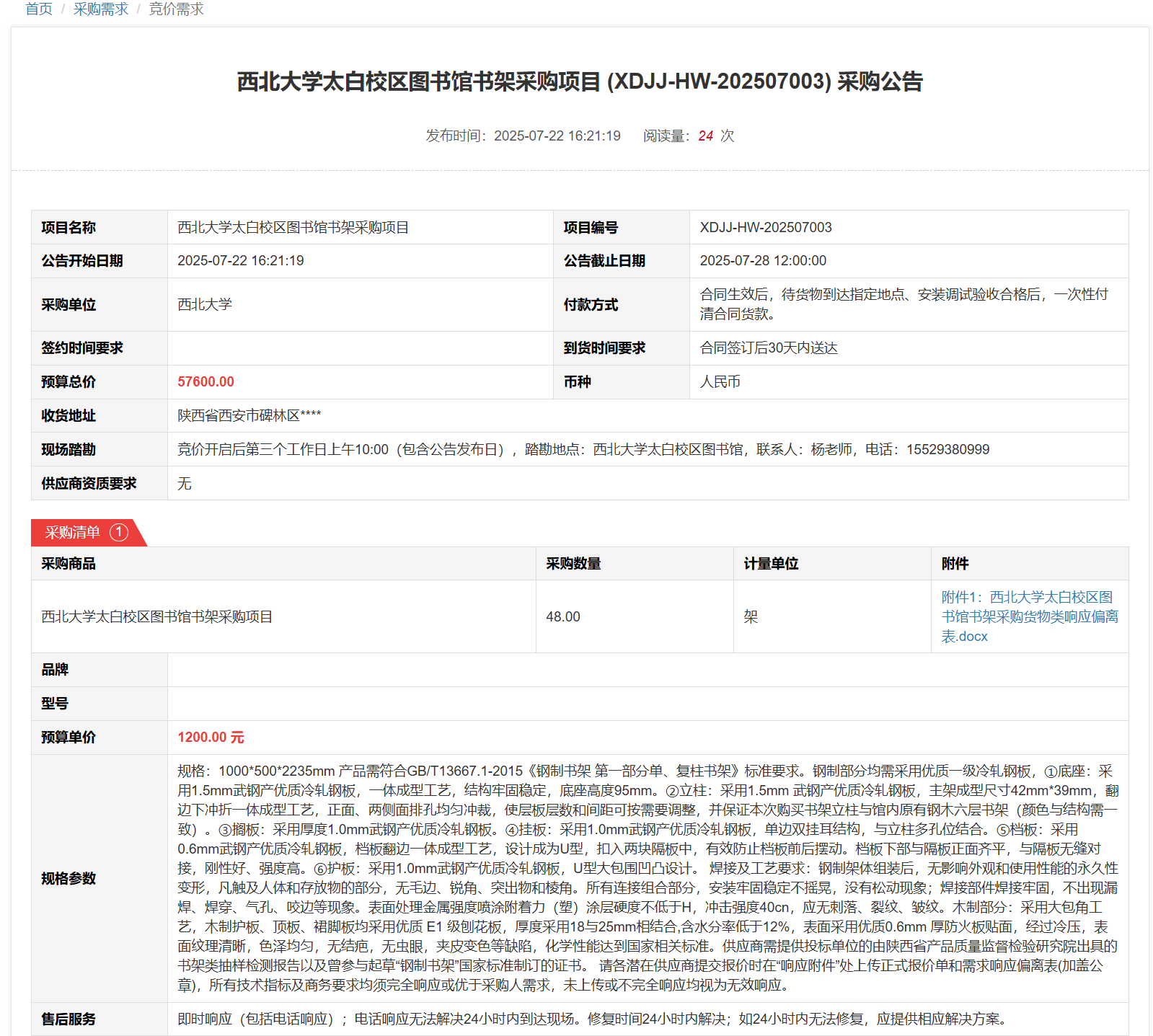伟德国际1949始于英国太白校区图书馆书架采购项目(XDJJ-HW-202507003)竞价采购公告 作者:采购与招标办公室 编辑: 时间:2025-07-22 原公告链接:https://www.ejingcai.com.cn/site/bidding/detail/19666