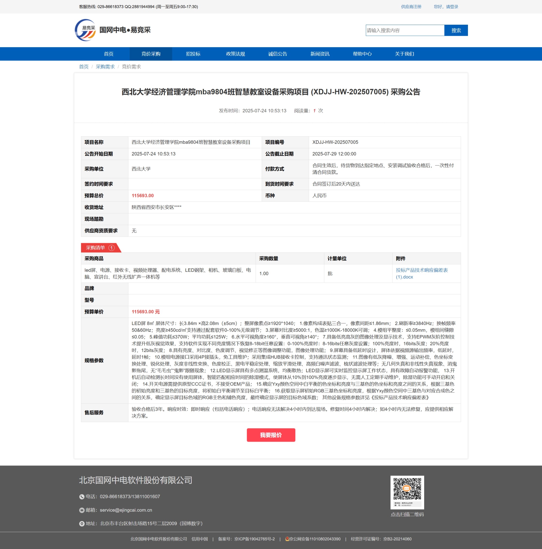 伟德国际1949始于英国经济管理学院mba9804班智慧教室设备采购项目 (XDJJ-HW-202507005)竞价采购公告 作者: 编辑:薛利娟 时间:2025-07-24 原公告链接:https://www.ejingcai.com.cn/site/bidding/detail/19708