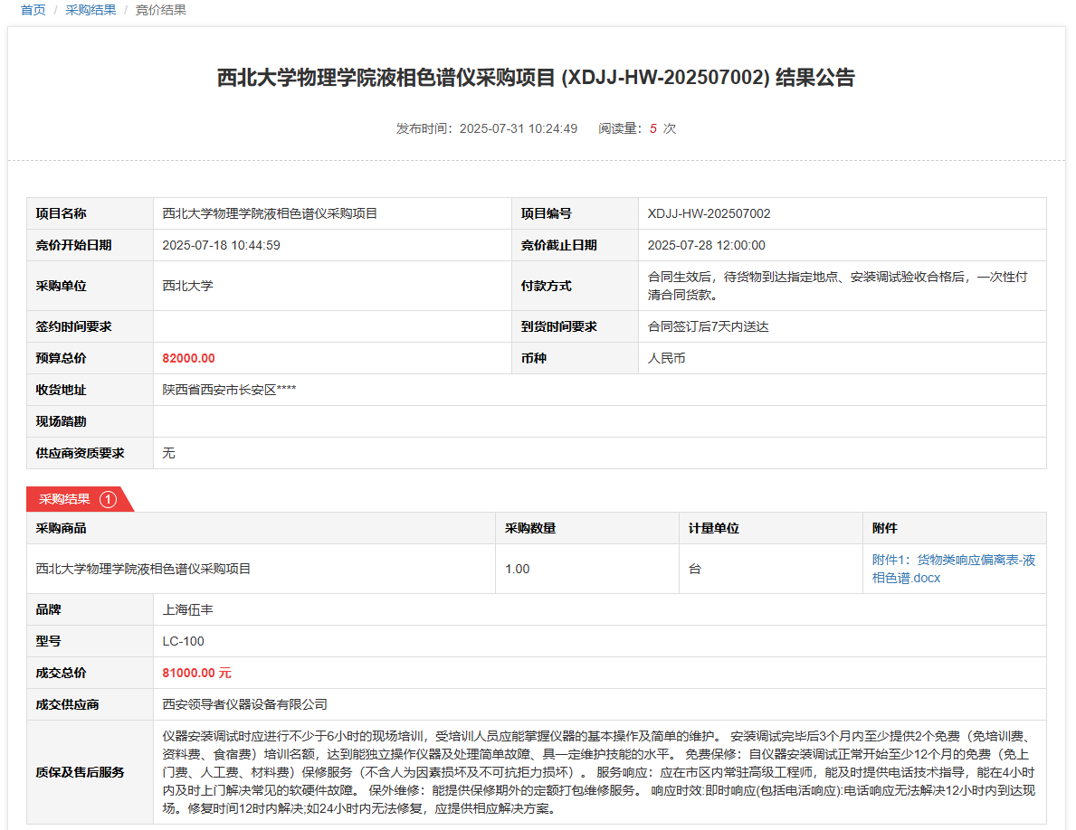伟德国际1949始于英国物理学院液相色谱仪采购项目(XDJJ-HW-202507002)竞价结果公告