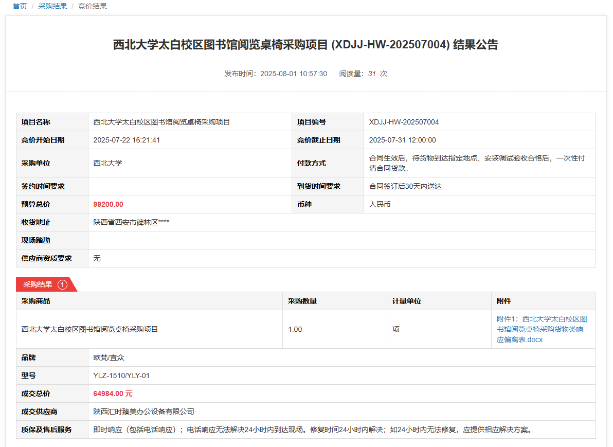 伟德国际1949始于英国太白校区图书馆阅览桌椅采购项目(XDJJ-HW-202507004)竞价结果公告