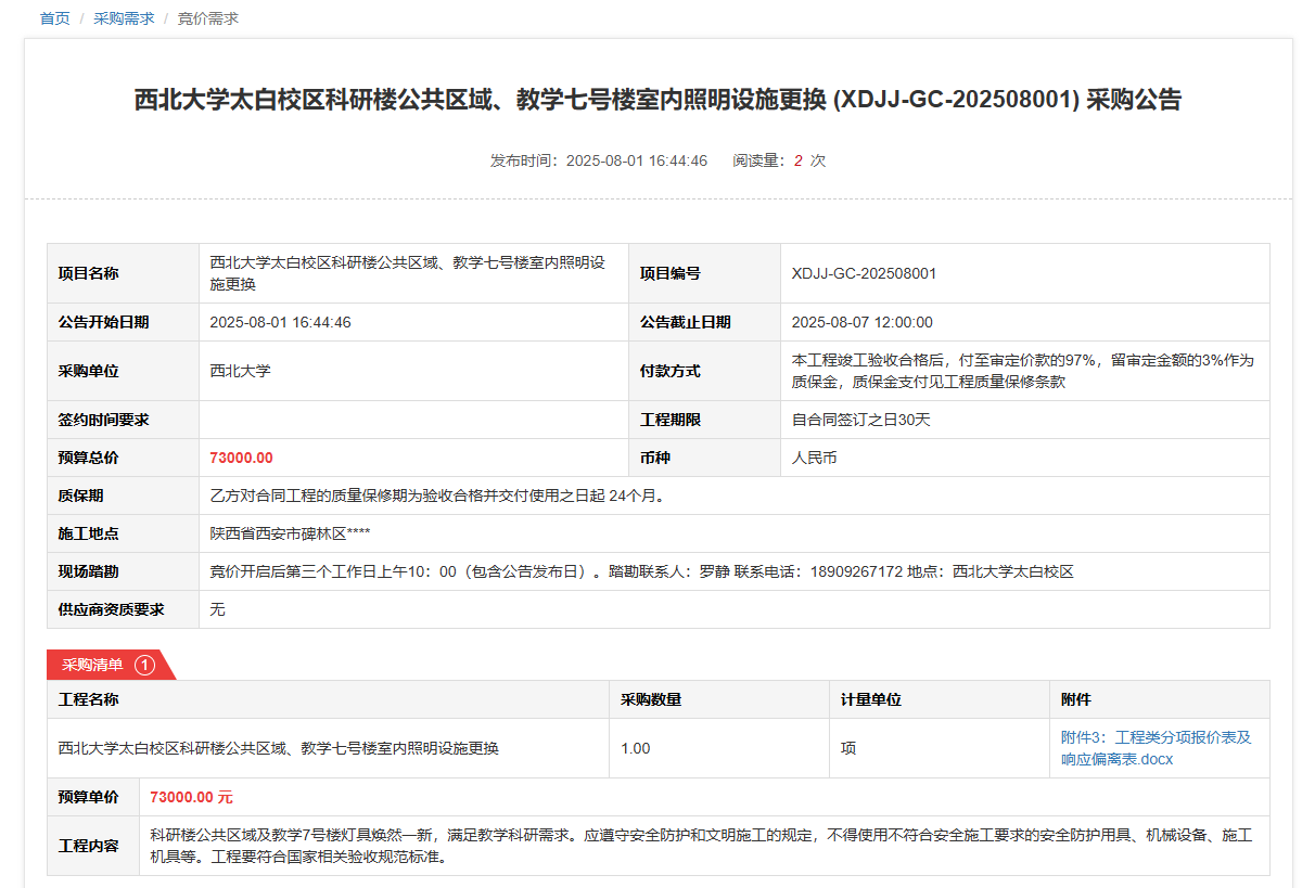 伟德国际1949始于英国太白校区科研楼公共区域、教学七号楼室内照明设施更换(XDJJ-GC-202508001)竞价采购公告
