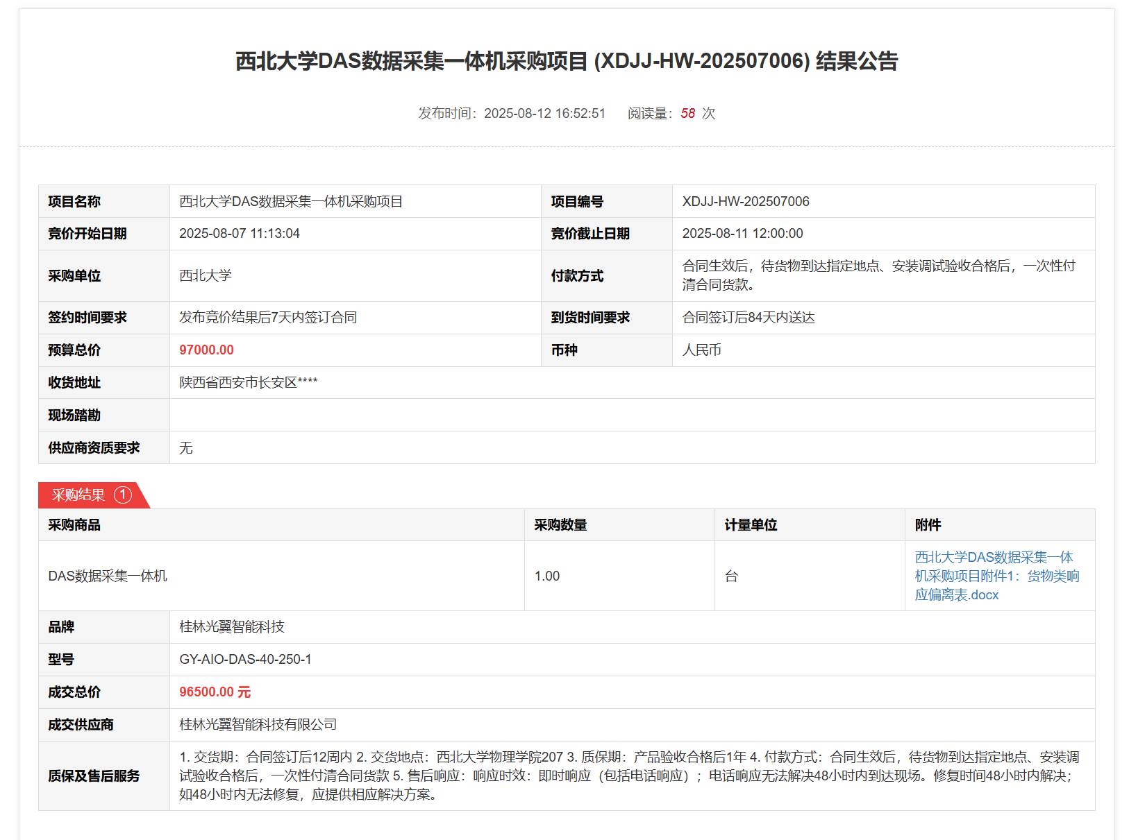伟德国际1949始于英国DAS数据采集一体机采购项目(XDJJ-HW-202507006)竞价结果公告