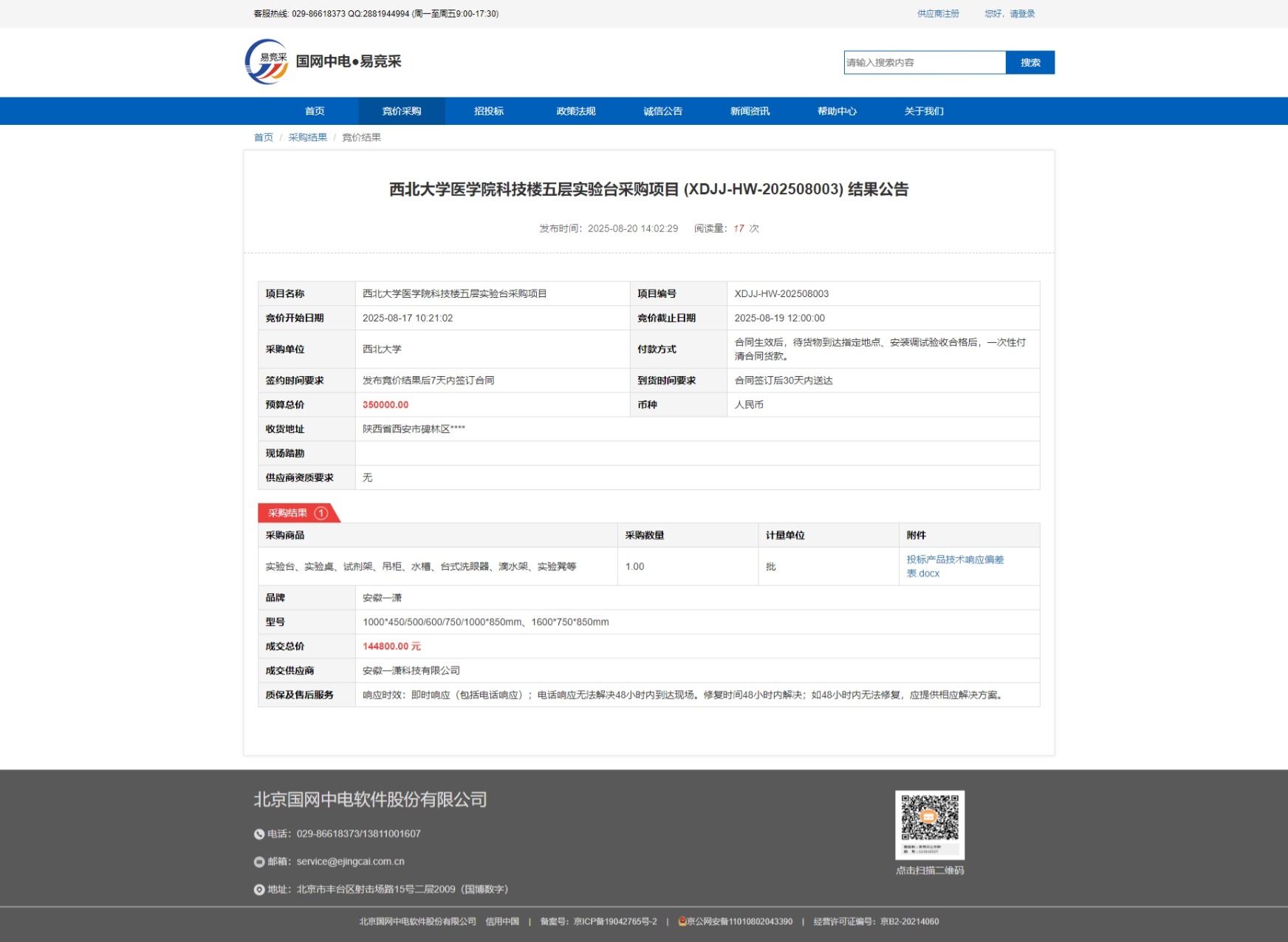伟德国际1949始于英国医学院科技楼五层实验台采购项目 (XDJJ-HW-202508003) 结果公告 作者: 编辑:采购与招标办公室 时间:2025-08-20 原公告链接:https://www.ejingcai.com.cn/site/bidding/detail/20040