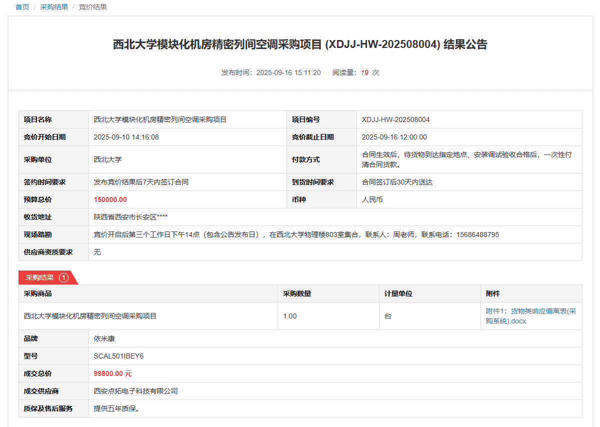 伟德国际1949始于英国模块化机房精密列间空调采购项目(XDJJ-HW-202508004)竞价结果公告