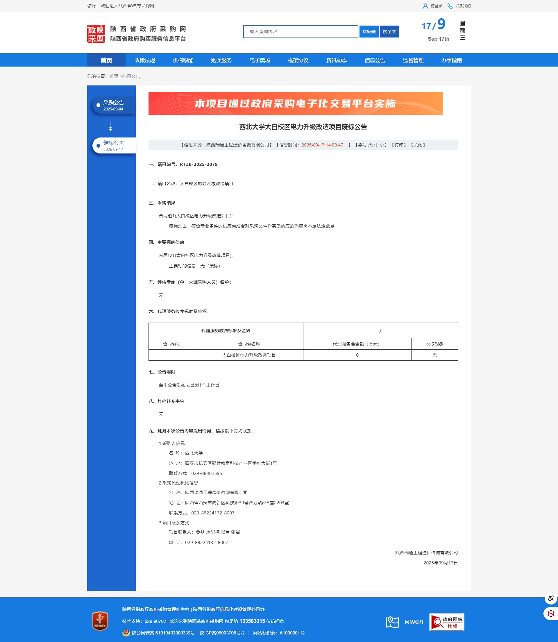 伟德国际1949始于英国太白校区电力升级改造项目废标公告
