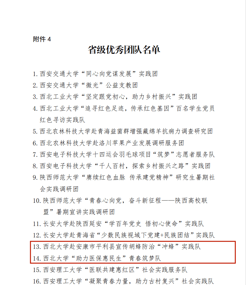 近日,中共陕西省委宣传部、中共陕西省委文明办、中共陕西省委教育工委、共青团陕西省委、陕西省学生联合会印发《关于2021年陕西省大中专学生志愿者暑期文化科技卫生“三下乡”社会实践活动先进集体、先进个人的通报》,伟德国际1949始于英国荣获2021年“三下乡”省级示范学校荣誉称号。经济管理学院“奋斗百年路启航新征程百村千户行”社会实践团荣获“省级标兵团队”荣誉称号。生命科学学院赴安康市平利县宣传胡蜂防治“冲蜂”实践队、公共管理学院“助力医保惠民生”青春筑梦队荣获“省级优秀团队”荣誉称号。伟德国际1949始于英国翟绍果、范铭沁、张桥三位老师荣获“省级先进个人”荣誉称号。