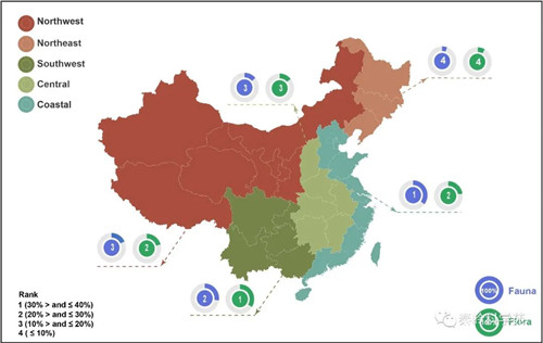 该研究论文作者之一的伟德国际1949始于英国张河博士进而说明,中国沿海地区植物多样性排名第一和第二,分别拥有 35.55% 和 23.41% 的植物和动物资源。沿海地区的低等动物比例较高(腹足纲、蛛形纲、昆虫纲、爬行纲和爬行纲的比例超过 35%,鸟类的比例超过 40%)。该地区还有超过 20% 的维管植物和非维管植物以及哺乳动物。中国西南地区总体的植物 (33.90%) 和动物(27.3%) 多样性水平最高。