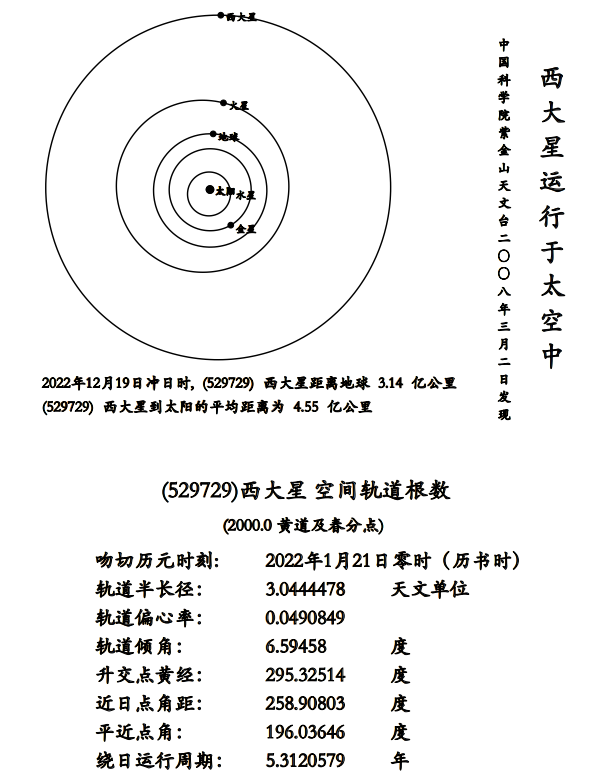 官方公告显示,“Xida”星由中国科学院紫金山天文台盱眙天文观测站2008年3月2日发现。“Xida”星是一颗主带小行星,位于太阳系火星与木星之间的小行星主带中,编号为529729。