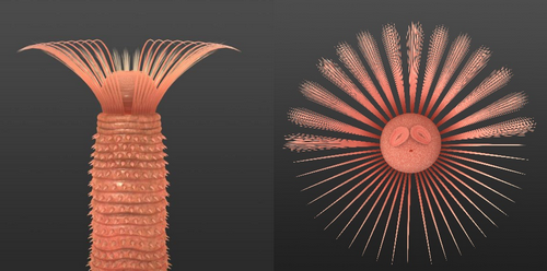澄江拟管虫因为身体前边发育成圈的刺而被解释为最早的帚虫,新的研究发现这些刺与帚虫的触手不同,是束状和栉状分布的,可以伸缩和内卷到身体前端,身体前端发育伸缩的吻部,吻部上长有成对的瓣鳃用于取食,这些与现代的扇毛虫类具有最大的相似性,张志飞说。