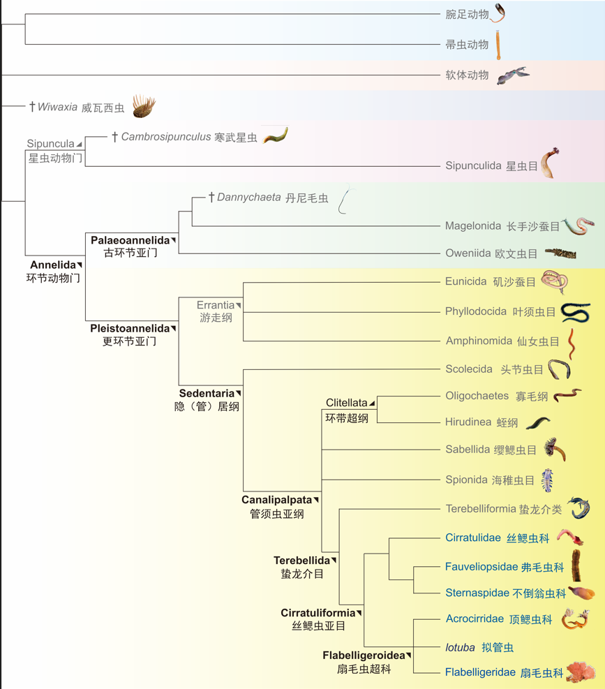 环节动物是现代重要的动物门类,在海洋和陆地上都十分常见,目前已知至少有2万多种、81科,主要以蚯蚓、沙蚕和蚂蟥最为常见。据最新系统研究,环节动物主要分为古环节型亚门和更环节型亚门,之前有研究认为环节动物出现在寒武纪早期,但以游走型多毛类报道居多,主要隶属环节动物干群或者古环节动物亚门。目前研究认为环节动物门存在或起源于隐居类祖先,现代的扇毛虫(俗称笼头虫)就属于这个类群,但缺乏早期化石记录。