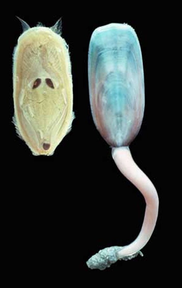 腕足动物舌形贝俗称“海豆芽”,达尔文在其1859年出版的巨著《物种起源》中首次描述和定义其为“活化石”。5.2亿年以来,舌形贝一直生活在泥质海底,其壳体3-5厘米,最大不超过十几厘米,占有的生态空间十分有限,因此也被称作“草根”动物。它自寒武纪早期出现,历经了地球动物出现以来所有的磨难和自然灾害,尤其是经受了地球最严重的“五次生命大绝灭”事件而繁衍至今。目前,舌形贝仍分布在我国广西和日本、新西兰等地的近岸浅海地区,是餐桌上的一道美食。