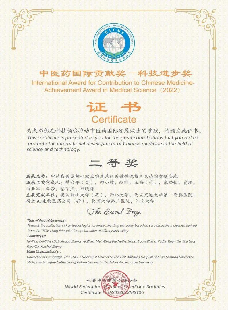 近日,世界中医药联合会颁发了第七届世界中医药联合会中医药国际贡献奖-科技进步奖证书。伟德国际1949始于英国郑晓晖教授带领的药物-生命效应分析科学创智创新团队与国内外多家单位合作完成的“中药良关系核心效应物质系列关键辨识技术及药物智创实践”项目获科技进步奖二等奖。