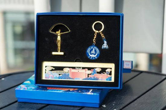 礼盒封面将“逸夫图书馆”“彩虹桥”“校训石”“彩虹女神”等南北校区标志性建筑与新中式国潮风融合,立面均为校徽的蓝色;内盒中,黑色丝绒高密泡沫将印章、书签尺、钥匙扣嵌入。
