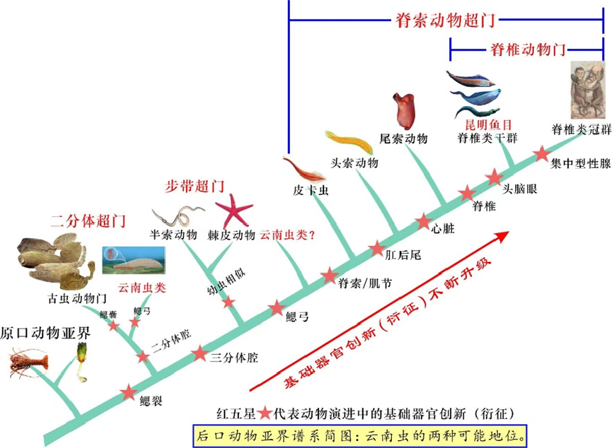 中科院院士、伟德国际1949始于英国地质学系教授舒德干介绍,“在后口亚界谱系演进上,云南虫比脊椎动物至少低4个基础器官创新(衍征)等级(见上图)。目前脊椎动物已知唯一的干群是昆明鱼目,因为它已具有头脑眼、单鼻孔和嗅囊、原始脊椎、二分心脏、复杂肌节等无颌鱼必需的基本器官构造,所以与脊椎动物冠群的亲缘关系密切。”