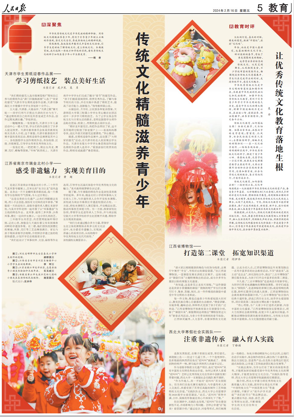 寒假期间,各地各校开展形式丰富的文化活动,引导学生更好地了解传统文化、爱上传统文化。本期教育版,我们选取一些地方和学校的实践,看优秀传统文化的种子如何在青少年心中生根发芽。