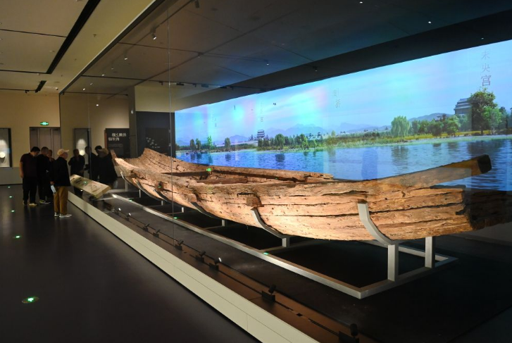 2024年5月6日,观众在陕西历史博物馆秦汉馆参观文物汉代古船“丝路一号”。新华社记者 李一博 摄