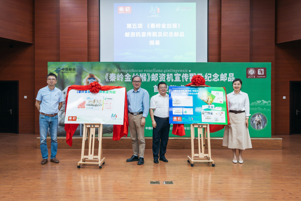 王明、张清和生命科学学院付爱根、齐晓光教授共同为《秦岭金丝猴》邮资机宣传戳及纪念邮品揭幕。赵辉宣读了《秦岭金丝猴》邮资机宣传戳发行批复。