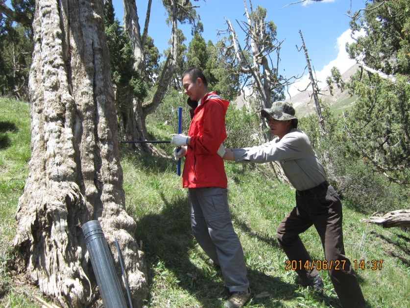 (徐国保在柴达木盆地利用生长锥获取柏树样芯)