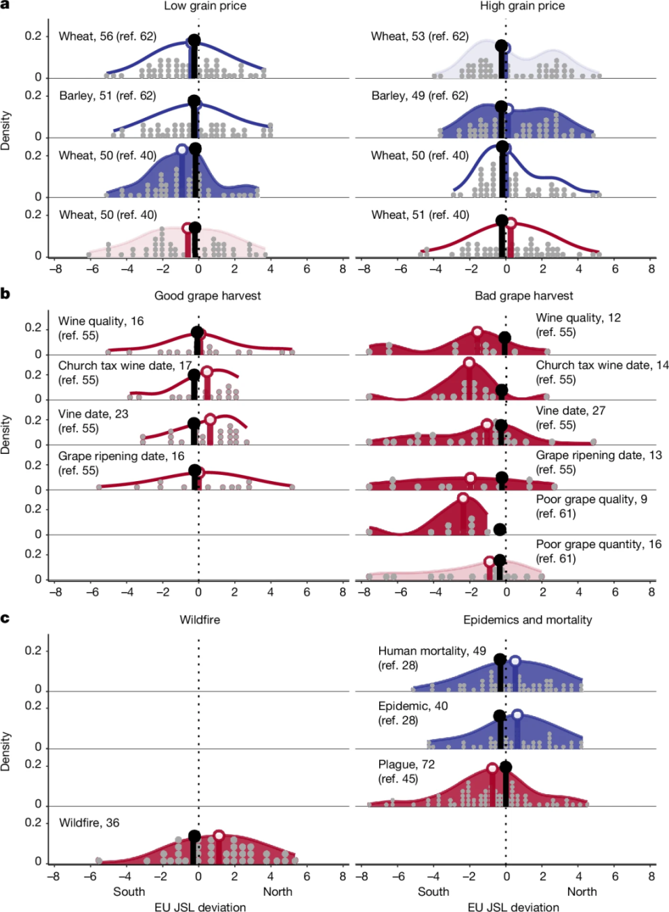 值得注意的是,欧洲过去700多年的急流“偶极”模态在历史文献记录中也有反映。研究团队利用了现有的气候重建数据以及数个世纪以来关于热浪、干旱、洪水、风暴、收成、饥荒、疾病等欧洲丰富且可靠的文献数据集,发现了急流纬度位置的极端变化与生物物候(葡萄收获)、农业经济和人类人口影响之间存在着某种联系。