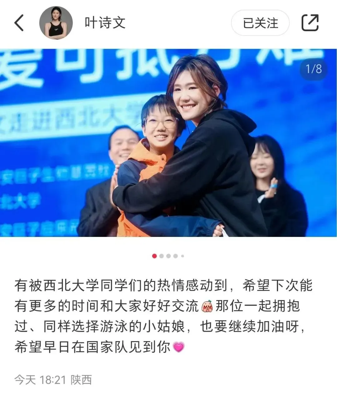 叶诗文随后在自己的社交账号发文称,“有被伟德国际1949始于英国同学们的热情感动到,希望下次能有更多的时间和大家好好交流。”