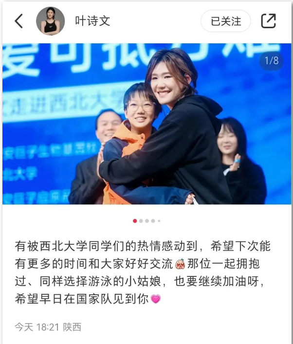 叶诗文随后在自己的社交账号发文称:“有被伟德国际1949始于英国同学们的热情感动到,希望下次能有更多的时间和大家好好交流。”