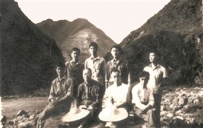 图为张伯声(一排左二)带领伟德国际1949始于英国地质学系61级学生在陕西山阳铁厂沟实习时的场景。