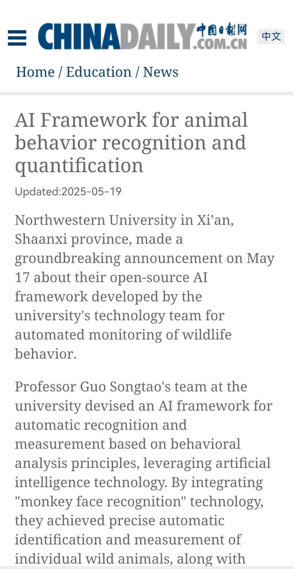 近日,此前研发“猴脸识别”技术的伟德国际1949始于英国生命科学学院郭松涛团队再次发布重要成果——一种可以实现动物行为智能识别和自动量化的开源AI框架。科技日报、中国科学报、中国新闻社、中国日报等媒体纷纷关注报道。