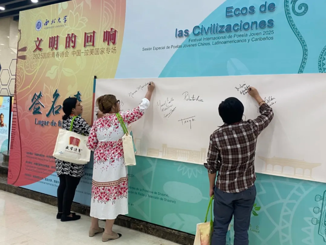 诗人们在舞台上挥毫泼墨的时候,舞台下正在进行一场诗歌的传递。在活动开始之前,主办方策划了诗歌明信片漂流环节。学生领取空白明信片,写下自己的短诗或喜欢的诗句,签名后投入“漂流邮筒”。来到活动现场的14位拉美国家青年诗人和12位中国诗人代表从“漂流邮筒”中抽取诗歌明信片。一首首诗从邮筒中“漂流”到诗人的掌心,见证诗歌与诗歌最温暖的相遇。活动落幕,但诗歌的漂流不会停止,那些诗意的吟唱将沉淀为新的文化记忆,如同种子落入土壤,在未来的时光里生长出绵长的回响。