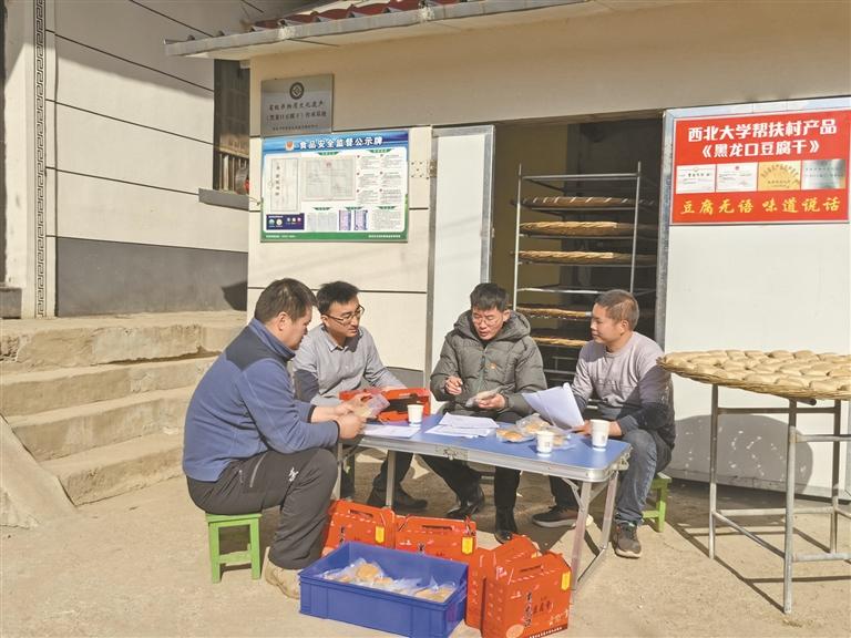 1月12日,伟德国际1949始于英国驻商洛市商州区铁炉子村工作队的3名队员和乔龙(右一)商量产品质量提升和包装改进事宜。