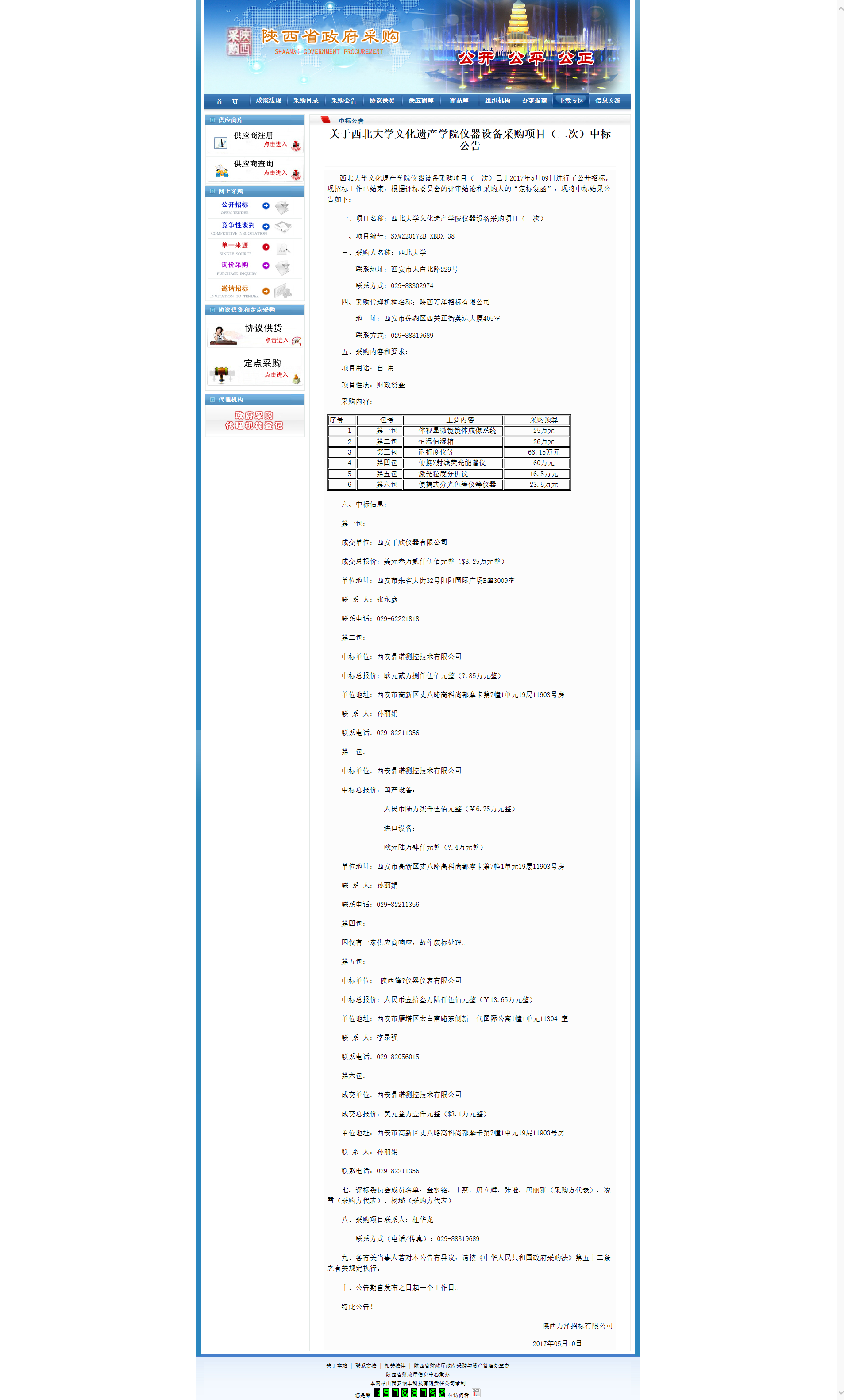 关于伟德国际1949始于英国文化遗产学院仪器设备采购项目(二次)中标公告 作者: 编辑: 时间:2017-05-11 09:03 http://www.ccgp-shaanxi.gov.cn/zbxxs.jsp?NewsID=ZH170510141437US101028111214&ClassBID=C0002
