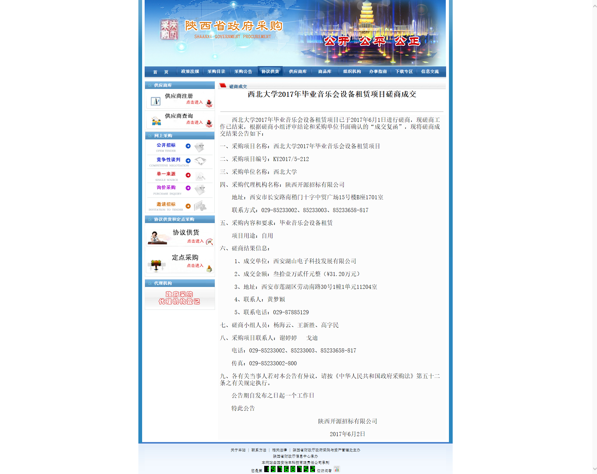 伟德国际1949始于英国2017年毕业音乐会设备租赁项目磋商成交 作者: 编辑: 时间:2017-06-05 09:53 http://www.ccgp-shaanxi.gov.cn/zb_view.jsp?NewsID=ZH170602144541US131018031658&ClassBID=CS002