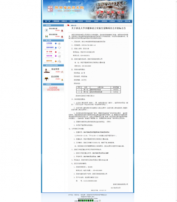 关于伟德国际1949始于英国多媒体语言实验室采购项目公开招标公告 作者: 编辑: 时间:2017-06-22 16:25 http://www.ccgp-shaanxi.gov.cn/zbxxs.jsp?NewsID=ZB170622125342US101028111214&ClassBID=C0001