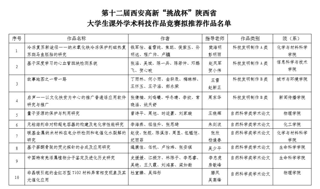 根据团中央《关于组织开展第十六届“挑战杯”全国大学生课外学术科技作品竞赛的通知》(中青联发〔2019〕1号)要求,结合伟德实际,校团委拟从伟德第九届“挑战杯”大学生课外学术科技作品竞赛优秀作品中遴选推荐《冷冻复苏新途径——纳米氧化铁冷冻保护剂磁热复苏斑马鱼胚胎的研究》等18件作品参加第十二届“挑战杯”陕西省大学生课外学术科技作品竞赛。现予以公示,公示期自2019年4月16日至4月23日。